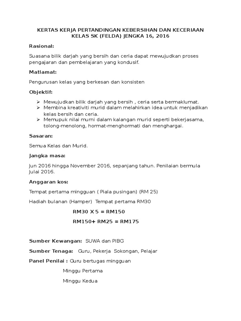Kertas Kerja Pertandingan Kebersihan Dan Keceriaan Kelas Sk Pdf